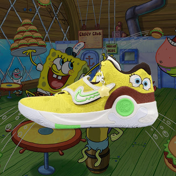 SpongeBob's signature bright yellow covers the streamlined KD Trey 5 silhouette, with hidden surprises in the upper—delicate sponge-like perforations mimic his iconic structure while enhancing breathability. Hand-painted SpongeBob eyes adorn the heel, sparkling with adorable charm, while a detachable star charm dangles from the side.